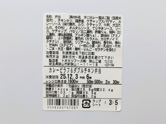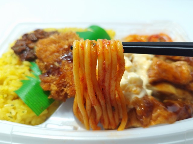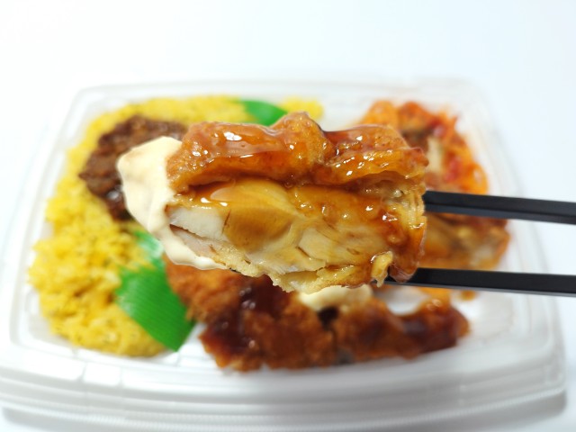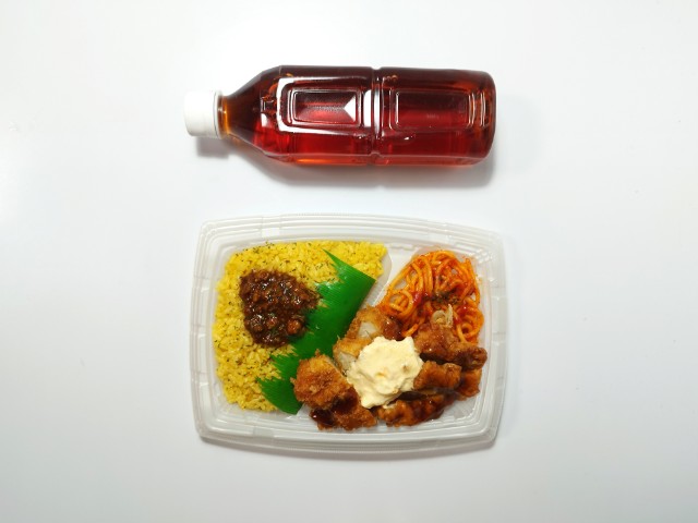 カレーピラフと鶏から揚げ、チキンカツがのったお弁当です。インパクトのある見た目のお弁当で、その味が気になって買ってみました。そんなカレーピラフ&ダブルチキン弁当ですが、カレーピラフはパラッとした食感とカレーの風味で、ハマってしまう美味しさです。カレーピラフの上にはキーマカレーがトッピングされていて、肉の旨味と濃厚なカレーの味わいで、ピラフとの相性抜群です。鶏から揚げはジューシーな肉質とてりやきソースの甘辛い味わい、チキンカツはほどよい弾力の肉質とソースの酸味、タルタルソースの旨味で、それぞれ食べ応えがあります。他にもスパゲティがのっているなど、最後のひと口まで飽きることなく食べられます。カレーピラフがやや薄めの味付けですが、キーマカレーや二つのチキンは濃厚な味わいなので、かなりバランスの良いお弁当になっていると思います。内容量は1食分にちょうどよく、お腹も満たされます。ぜひカレーピラフ&ダブルチキン弁当を食べてみて下さい。