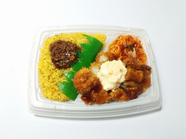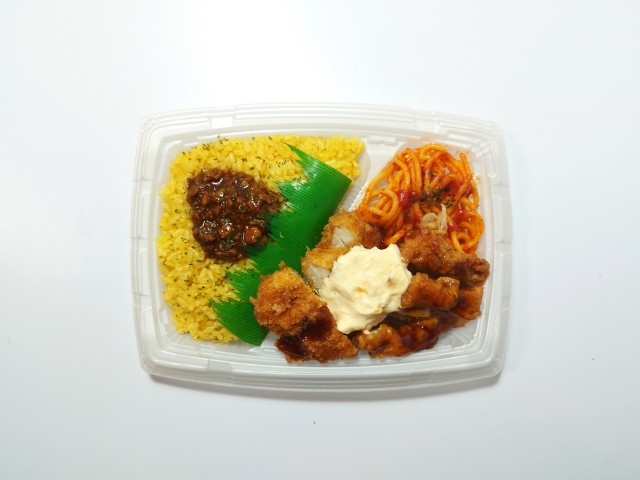 キーマカレーをトッピングしたカレーピラフに、塩こうじで漬け込んだ鶏から揚げとチキンカツを組み合わせたダブルチキン弁当です。