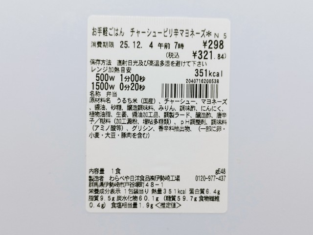熱量:351kcal、たんぱく質:6.4g、脂質:9.5g、炭水化物:60.1g(糖質:59.7g、食物繊維:0.4g)、食塩相当量:1.9g
