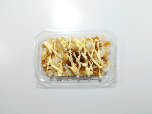 チャーシューと一味マヨネーズがのったお弁当です。シンプルな内容と価格に惹かれて買ってみました。そんなお手軽ごはんですが、ご飯には醤油ベースのタレが混ぜ込まれていて、醤油の味わいと砂糖のほのかな甘味、にんにくの風味があって、食べ出すと止まらなくなる美味しさです。トッピングには刻みチャーシューと一味マヨネーズがのっていて、豚肉のジューシーな味わいとマヨネーズの酸味、一味唐辛子のピリッとした辛味があって、味付ご飯ともよく合います。お手軽ごはんというだけあって、メインのおかずとご飯のみで、漬物やパスタといった箸休めはなく、容器も含めて全て無駄を省いている感じで、コスパの良いお弁当だと思います。ミニ弁当なので内容量は多くありませんが、小腹が空いた時や軽く済ませたい時などにピッタリです。ぜひチャーシューピリ辛マヨネーズのお手軽ごはんを食べてみて下さい。