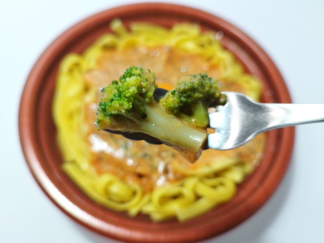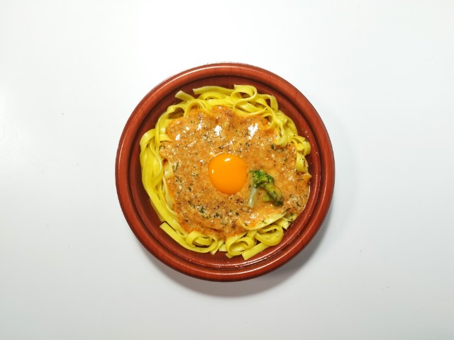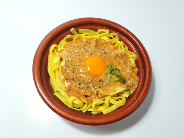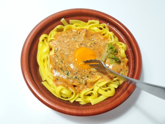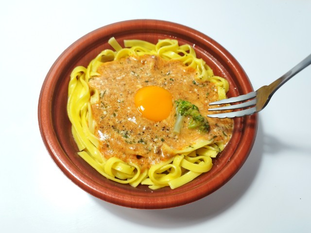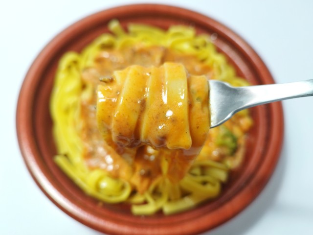 ソースたっぷりミートカルボナーラです。ソースたっぷり生パスタ カルボナーラ(2025年10月7日発売)ソースたっぷり生パスタ 明太カルボナーラ(2025年10月7日発売)ソースたっぷり生パスタ スモークチーズカルボナーラ(2025年11月3日発売)に続く、ソースたっぷり生パスタとしては第4弾となっていて、全てカルボナーラというのも面白い部分です。そんなミートカルボナーラですが、ソースミートソースの酸味チーズの風味クリームのなめらかな味わいがあって、クセになってしまう美味しさです。パスタカルボナーラといえばのフェットチーネが使われていて、平打ち麺もちもち食感ソースとよく合います。ポイントは卵黄ソースで、ソースと合わせる事で、たまごのコクが加わって、また違った味わいを楽しめます。他にもトッピングのブロッコリーに加えて、パセリの風味ブラックペッパーのピリッとした辛味などがあって、最後のひと口まで飽きることなく食べられます。内容量は1食分にちょうどよく、お腹も満たされます。ぜひソースたっぷり生パスタミートカルボナーラを食べてみて下さい。
