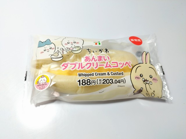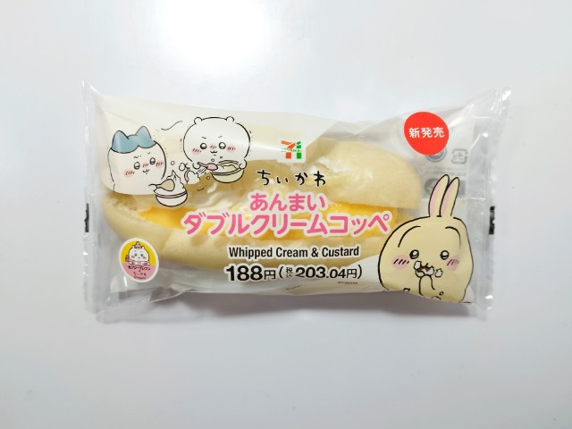 ホイップクリームカスタードクリームをたっぷりと挟んだ白いコッペパンです。セブンイレブンでは昨年の「セブンイレブン×ちいかわ あったまるね、きもち」キャンペーン(2024年12月3日~25日)に続き、今年も「ちいかわと冬をたのしんじゃお!」キャンペーン12月2日より開催していて、今回の商品もその対象商品の一つとなっています。そんなあんまいダブルクリームコッペですが、ふんわりとした生地しっとりとした食感ほのかな塩味で、安定の美味しさです。ホイップクリームなめらかな食感ミルクの風味カスタードクリームとろりとした食感たまごのコクで、相性抜群の組み合わせになっています。全体的にしっかりとした甘さを楽しめるコッペパンといった感じで、甘いのが好きな方にはピッタリだと思います。大きさは普通のコッペパンくらいで、おやつ小腹が空いた時にオススメです。ぜひあんまいダブルクリームコッペを食べてみて下さい。