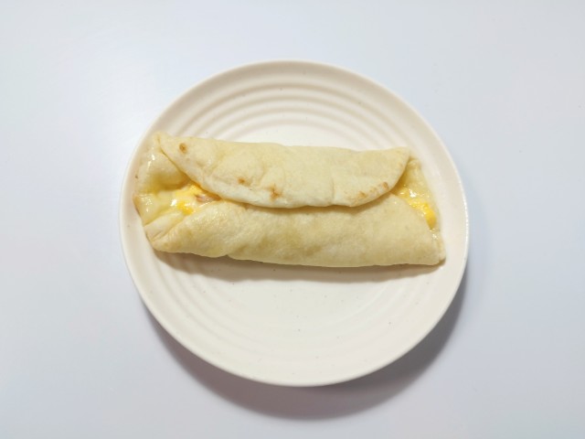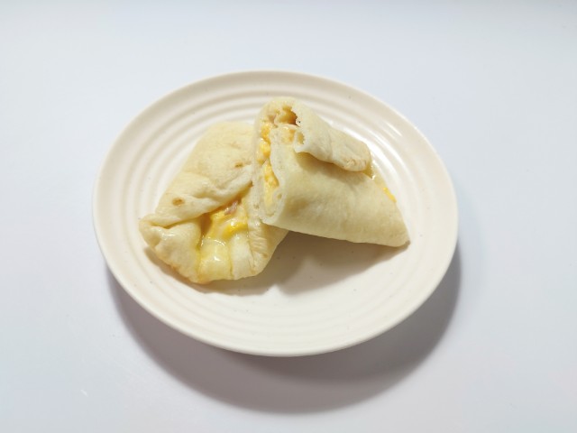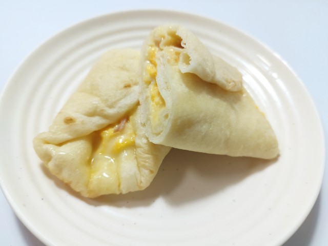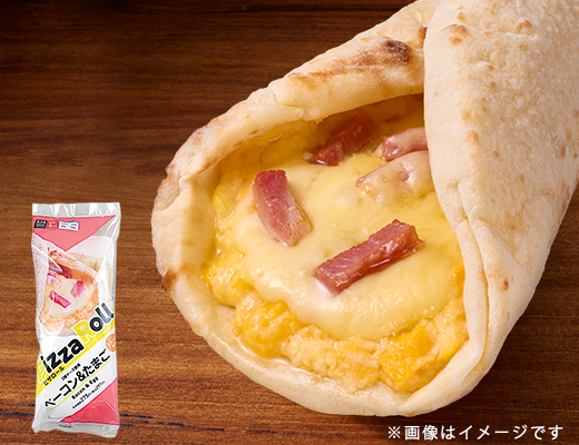 もちもちとしたピザ生地に、ベーコンとスクランブルエッグ、チーズを包みました。