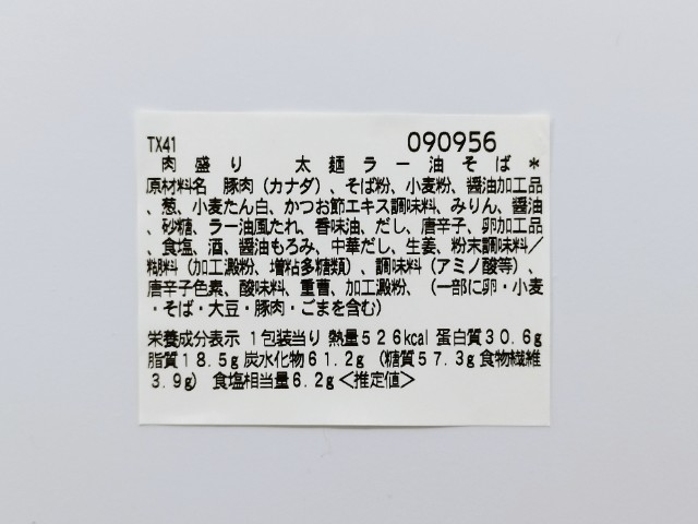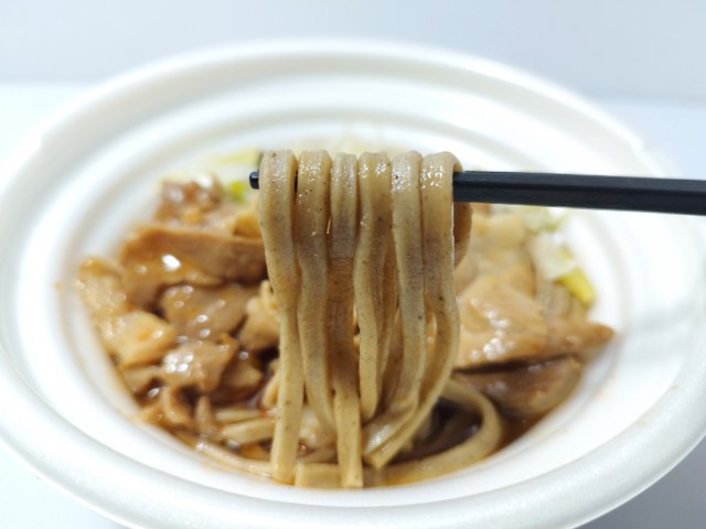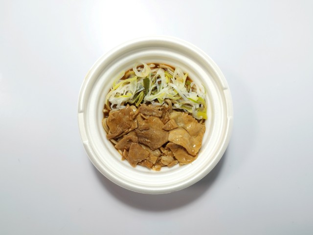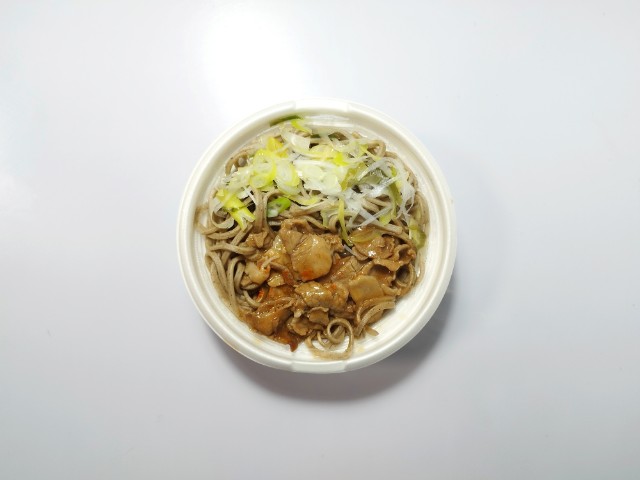豚肉とねぎがのった温かいそばです。ラー油や太麺といった普通のそばとはまた違った感じに惹かれて買ってみました。そんな肉盛り太麺ラー油そばですが、つゆはだしの旨味と醤油の風味、ラー油のピリッとした辛味で、クセになってしまう美味しさです。太めのそばはそばの風味とコシがあって、食べ応え抜群です。具材には豚肉やねぎがのっていて、豚肉の甘辛い味わいとねぎのシャキシャキ食感が味や食感のアクセントになっています。辛味はそこまでないので、辛いのがちょっと苦手な方でも普通に食べられますし、辛いのが好きな方は追いラー油をしても美味しいと思います。内容量は1食分にちょうどよく、お腹も満たされます。ぜひ肉盛り太麺ラー油そばを食べてみて下さい。