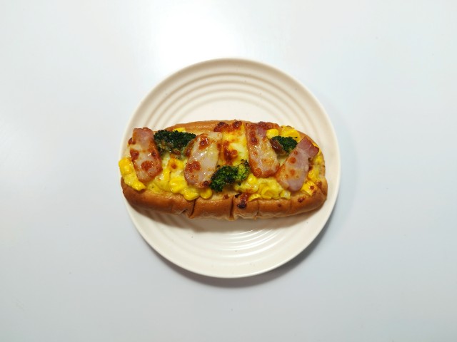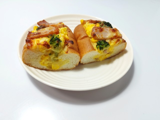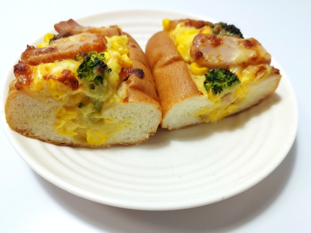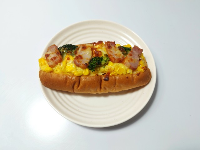 コーンクリームソースベーコンブロッコリーなどがのった惣菜パンです。同様の商品として、以前にポテトとベーコンのホワイトソース(2025年10月22日発売)がありましたが、今回はコーンクリームソースが使われています。そんなコーンとベーコンのクリームソースですが、生地ふっくらとした食感歯切れの良さで、安定の美味しさです。トッピングにはコーンクリームソースを始め、コーンベーコンブロッコリー2種のチーズなどがのっていて、それぞれの味や食感を楽しめます。コーンの甘味シャキっと食感を楽しめる惣菜パンといった感じで、最後のひと口まで飽きることなく食べられます。大きさは普通の惣菜パンくらいで、小腹が空いた時主食にあと一品追加したい時にピッタリです。ぜひコーンとベーコンのクリームソースを食べてみて下さい。