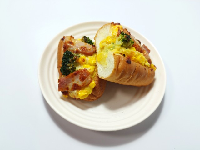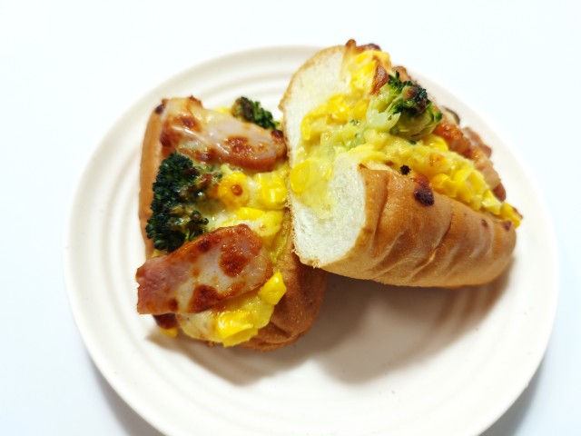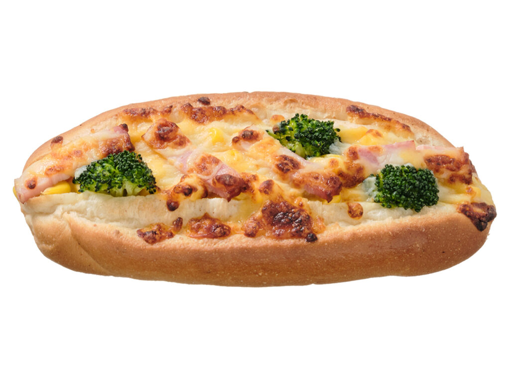 スイートコーンがたっぷり入ったコーンクリームソースに、コーン,ベーコン,ブロッコリー,2種のチーズをのせて焼いた、温めて美味しいロールです。