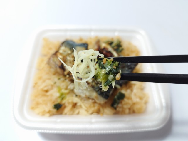 炙り焼さばがのったお弁当です。以前にさばのほぐし身を使った2種のだしが決め手のさばほぐしごはん(2025年8月12日発売)がありましたが、今回は炙り焼さばになっています。そんな炙り焼さばごはんですが、焼さばさばの旨味ふっくらとした身で、ご飯が進む一品になっています。ご飯だし飯になっていて、だしの風味ほのかな塩味があって、美味しいのひと言です。他にも生姜の酢漬け小松菜炒めがのっていて、最後のひと口まで美味しく食べられます。お弁当小容量なので小腹が空いた時軽く食べたい時などにちょうどよく、別にサラダカップ麺などを付けてバランスや味を楽しむのも、このサイズのお弁当なら余裕で出来ます。ぜひ炙り焼さばごはんを食べてみて下さい。