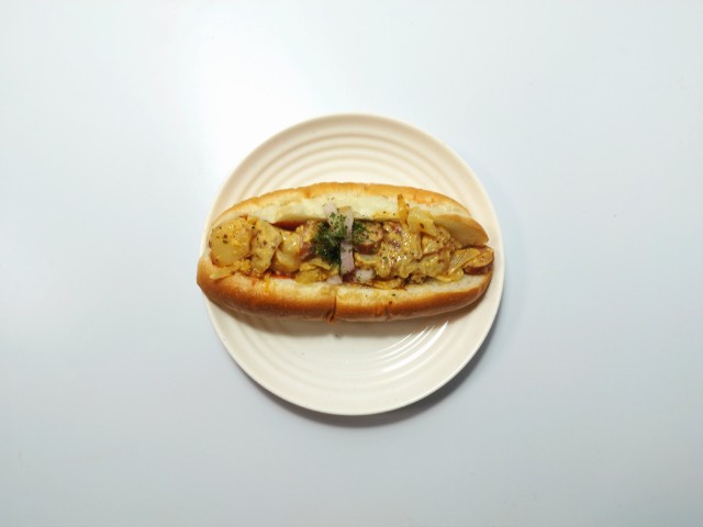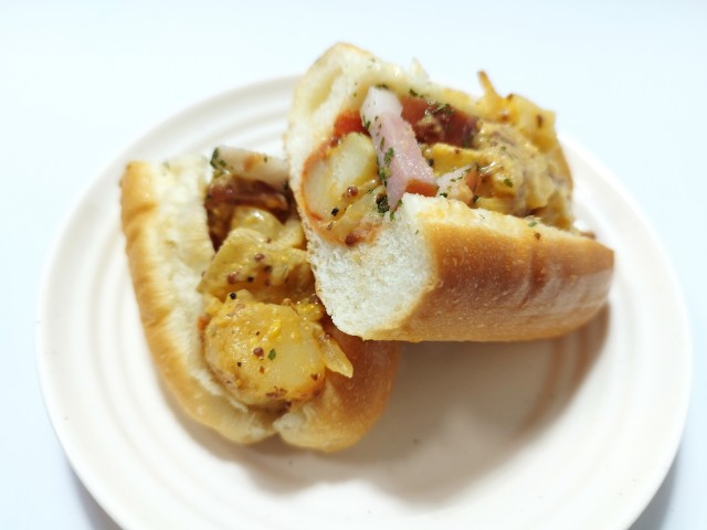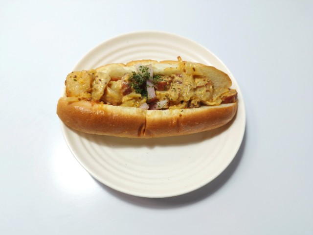 ソーセージの旨味がアクセントのジャーマンポテトを挟んだロールパンです。