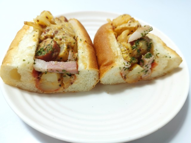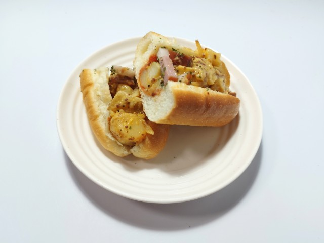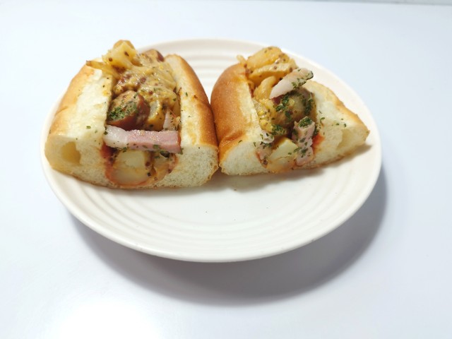 ジャーマンポテトを挟んだロールパンです。ジャーマンポテトとロールパンの組み合わせに惹かれて買ってみました。そんなジャーマンポテトロールですが、パン生地は温めたのもありますが、しっとりとした食感と小麦の風味で、安定の美味しさです。ジャーマンポテトはじゃがいもの味わいとソーセージの旨味、玉ねぎの甘味があって、生地とのバランスも良いです。ポイントは味付けで、粒マスタードやトマトケチャップ、マヨネーズ、胡椒といった調味料を上手く組み合わせる事で、ジャーマンポテトの美味しさがさらに引き立っています。大きさは普通のコッペパンくらいで、小腹が空いた時や主食にあと一品追加したい時にピッタリです。ぜひジャーマンポテトロールを食べてみて下さい。