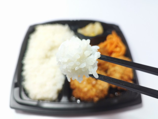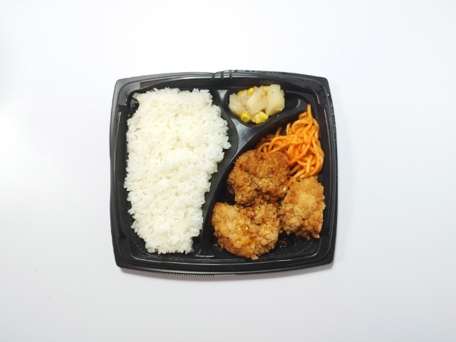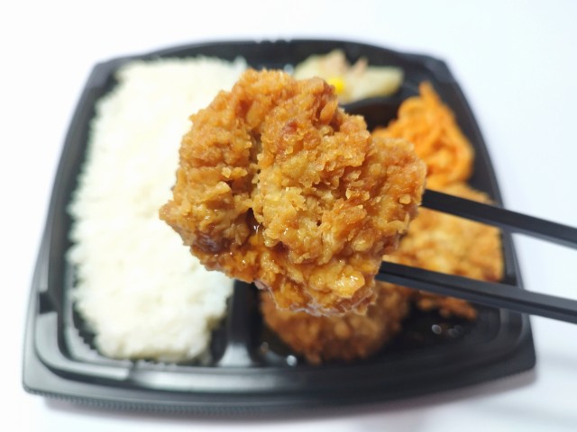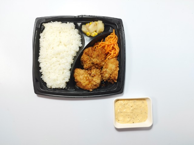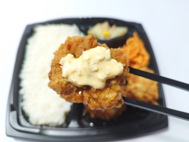 低温と高温の油で二度揚げした唐揚げに別添のタルタルソースをかけて食べるお弁当。タルタルソースは卵、玉ねぎ、ピクルスの具材感が感じられる仕立て。