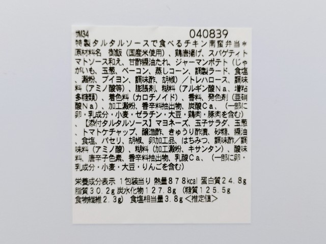 熱量:878kcal、たんぱく質:24.8g、脂質:30.2g、炭水化物:127.8g(糖質:125.5g、食物繊維:2.3g)、食塩相当量:3.8g