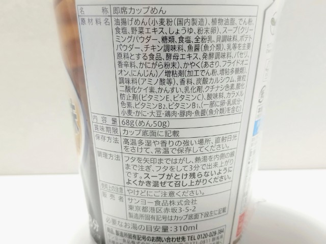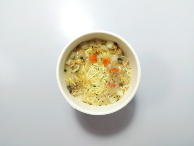 クラムチャウダー味のヌードルです。クラムチャウダー味と税込170円という価格に惹かれて買ってみました。そんなカップ麺ですが、とろみのあるスープはあさりの旨味とチキンの風味、クリーミーな味わいで、飲み干してしまいたくなる美味しさです。麺は歯切れの良さと小麦の風味で、濃厚スープにもよく絡みます。具材にはあさりやフライドオニオン、人参が入っていて、それぞれの味や食感を楽しめます。本格的なクラムチャウダーとは違うものの、クラムチャウダーに近い味わいで、価格から見ても満足度が高いカップ麺だと思います。内容量は普通のカップ麺サイズで、小腹が空いた時やおにぎりやパンと合わせて1食分にするにもオススメです。ぜひクラムチャウダー味ヌードルを食べてみて下さい。