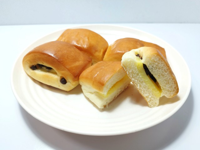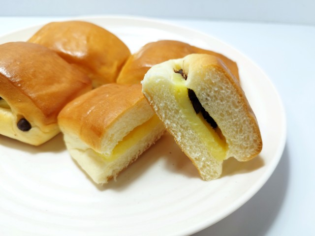 カスタードクリームとチョコチップを使ったクリームパンです。カスタードクリームとチョコチップの組み合わせの段階で、美味しいイメージしかなく買ってしまいました。そんなしっとりカスタードクリームパンですが、生地はしっとり食感と歯切れの良さで、安定の美味しさです。中のカスタードクリームはなめらかな食感とたまごのコクがあって、生地とのバランスも良いです。チョコチップはチョコの甘味ととろけるような食感で、味や食感のアクセントになっています。4個入ですが、1個はふた口サイズくらいなので、一人でも普通に食べ切れます。もちろんシェアするにもピッタリです。ぜひしっとりカスタードクリームパンを食べてみて下さい。