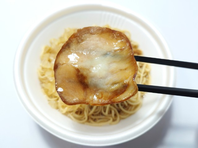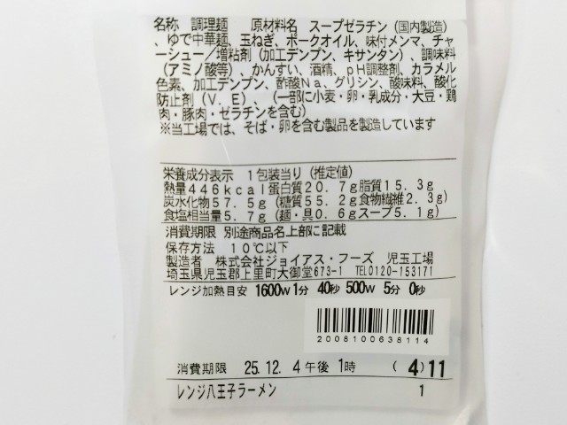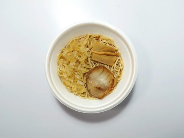 八王子ラーメンです。以前に【関東の一部】八王子ラーメン(2024年1月6日発売)がありましたが、今回はTOKYO MXとのコラボ商品になっているので、別物として紹介しています。ちなみに今回の商品は八麺会のお墨付きの一品という事になっています。その八麺会をネットで調べたところ、八王子市と八王子ラーメンをこよなく愛する人達の集まりだそうです。また、八王子ラーメンは醤油ベースのタレであること、表面をラードで覆っていること、刻み玉ねぎを用いていることといった3つの定義があるそうです。そんな八王子ラーメンですが、スープは醤油の風味とラードのコクがあって、思わず飲み干してしまたくなる美味しさです。中細のストレート麺はツルツルとした食感と歯切れの良さで、醤油スープとの絡みも良く、刻んだ玉ねぎの甘味も一緒に楽しめます。具材にはチャーシューやメンマ、刻み玉ねぎがのっていて、それぞれの味や食感を楽しめます。特に刻み玉ねぎは玉ねぎの甘味があって、スープの美味しさをさらに引き立てています。内容量は1食分にちょうどよく、お腹も満たされます。ぜひ八王子ラーメンを食べてみて下さい。