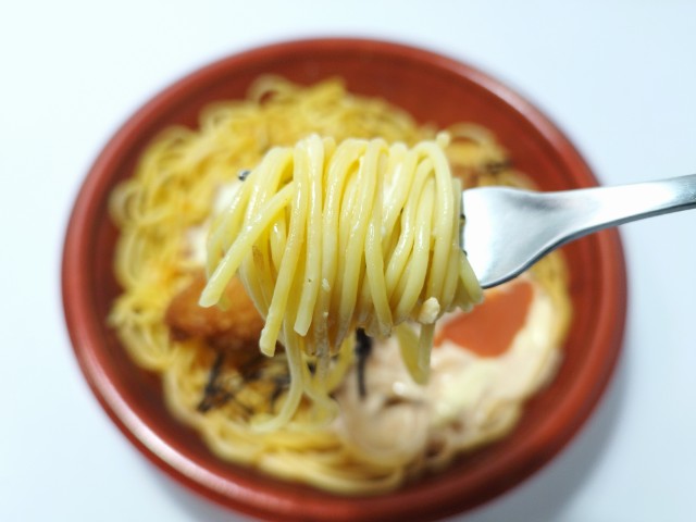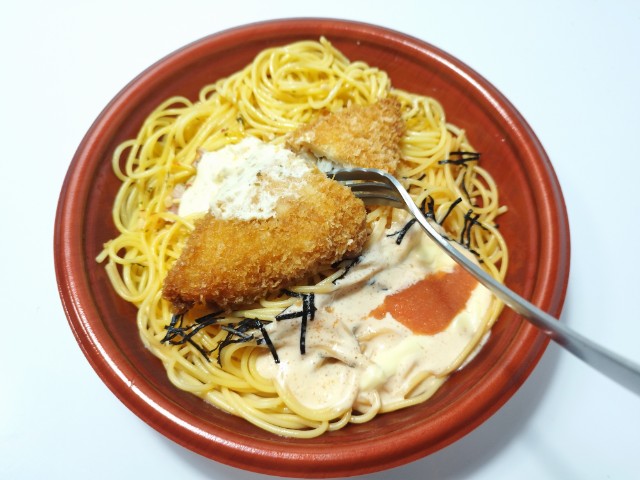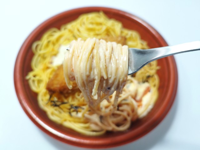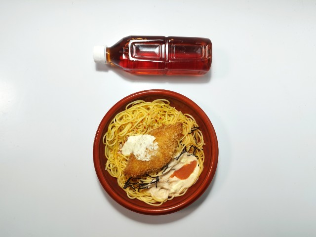 ペペロンチーノと明太マヨネーズのパスタを同時に楽しめる商品です。以前によくばりセットメシ ボンゴレ&トマト(2025年10月21日発売)がありましたが、今回はペペロンチーノと明太マヨネーズパスタの組み合わせになっています。そんなよくばりセットメシですが、ペペロンチーノはにんにくの風味と唐辛子のピリッとした辛味、明太マヨネーズは明太子の旨味とマヨネーズの酸味があって、それぞれ違った味わいを楽しめます。パスタはほどよい硬さと小麦の風味で、食べ応えがあります。二つのパスタの境に置かれている白身フライはふっくらとした身とタルタルソースの酸味で、箸休めにピッタリです。内容量は1食分にちょうどよく、お腹も満たされます。ぜひペペロンチーノ&明太マヨネーズのよくばりセットメシを食べてみて下さい。