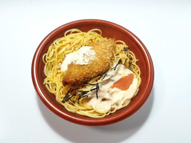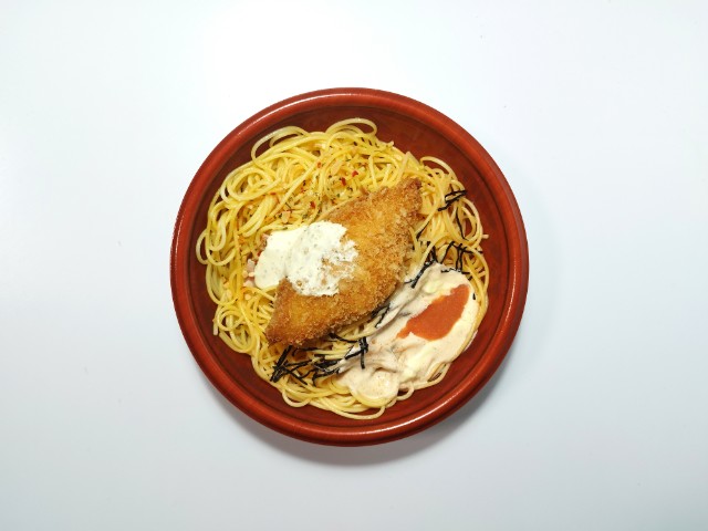 ペペロンチーノと明太マヨネーズの2種類のパスタに白身フライをトッピングしたよくばりセットメシです。