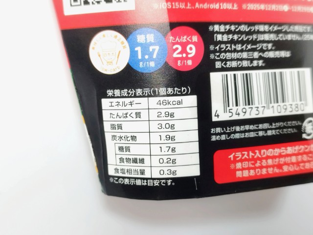 からあげクンの黄金チキンレッド味です。からあげクンの黄金チキン味(2025年12月2日発売)と同時発売された商品で、その味が気になって買ってみました。そんなからあげクンですが、衣のサクッとした食感とジューシーな鶏肉の味わいがあって、食べ出すと止まらなくなる美味しさです。味は唐辛子の辛味とスパイスの風味、ハーブの香りがあって、ヤミツキになってしまう美味しさです。ただ、見た目以上に辛味があるので、辛味が苦手な方は注意が必要かもしれません。5個入ですが、1個はひと口サイズなので、一人でも普通に食べ切れます。ぜひからあげクン黄金チキンレッド味を食べてみて下さい。