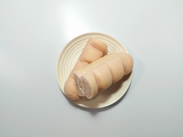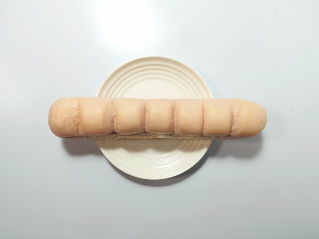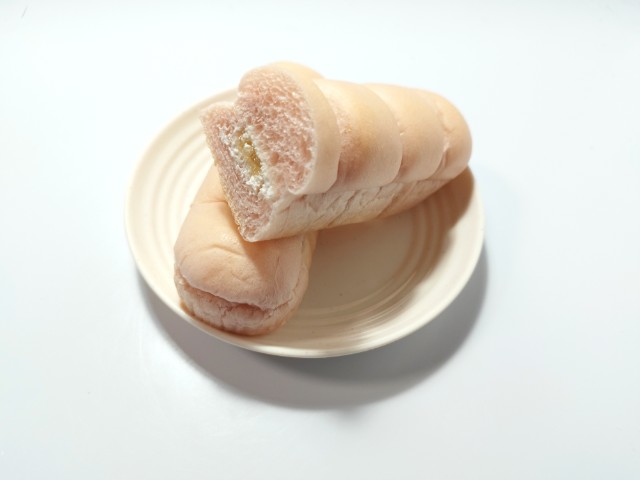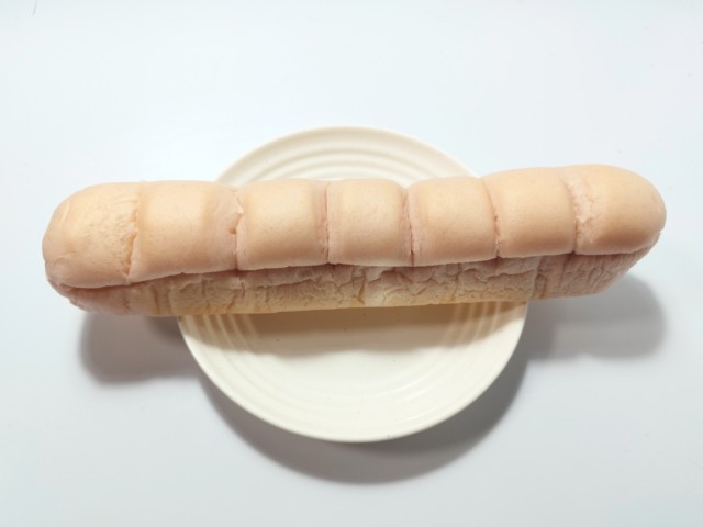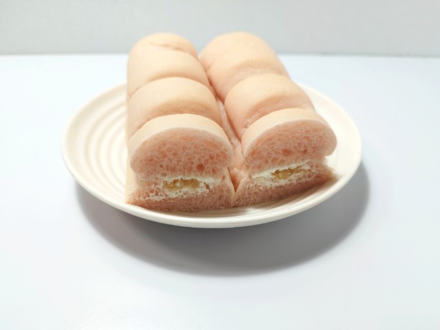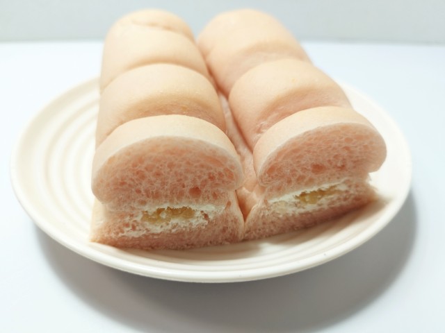 白桃ジャムとヨーグルトホイップを使ったちぎりパンです。白桃ジャムとヨーグルトホイップの組み合わせに惹かれて買ってみました。そんなちぎりパンですが、生地はふんわりとした食感と歯切れの良さで、どんどんと食べ進められます。また、生地は見た目と違って桃の風味などは一切なく、小麦の風味を感じるシンプルな味わいになっています。生地の間に挟まっている白桃ジャムは桃の味わいとジャムの甘味、ヨーグルトホイップはヨーグルトのほのかな酸味とすっきりとした後味で、生地とのバランスも良いです。ポイントは商品名の通り、ちぎりながら食べるパンなので、ちぎりやすいようにパン生地には溝が出来ている部分だと思います。横に長いパンですが、縦幅はないので、一人でも普通に食べ切れます。ぜひ白桃ジャム&ヨーグルトホイップのちぎりパンを食べてみて下さい。