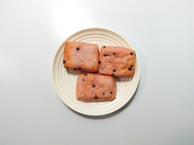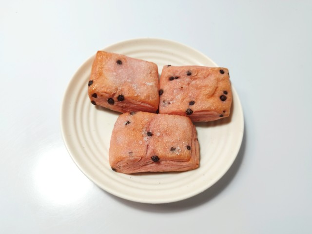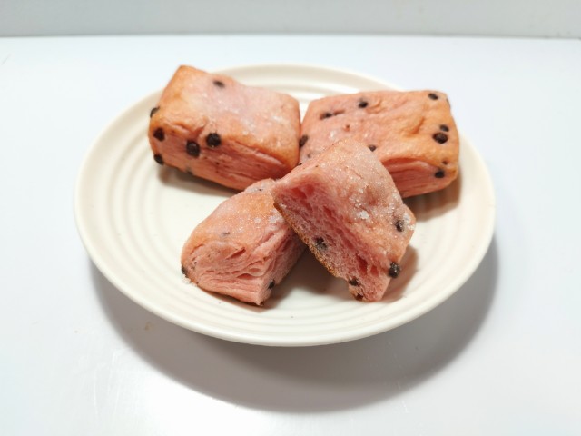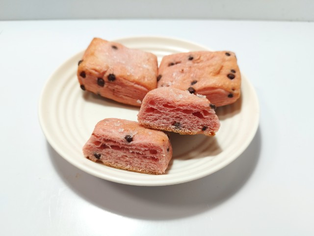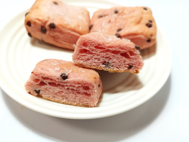 いちごが香るいちご色の生地に、チョコチップを折り込んだブリオッシュ。