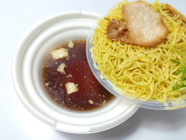 セパレートタイプなので、麺と具材を背脂入りのスープに入れます。