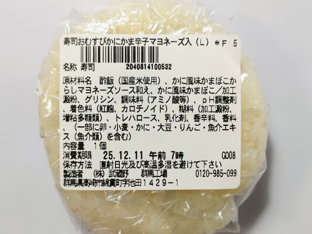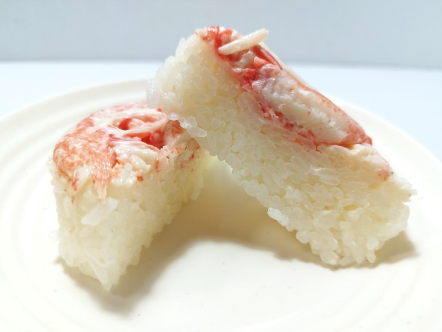 かにかまがのった寿司おむすびです。以前に寿司おむすび 海鮮サラダ(2025年7月29日発売)がありましたが、今回はかにかまになっています。そんな寿司おむすびですが、酢飯はほどよい酸味としっとりとした食感で、安定の美味しさです。酢飯の上にはかにかまがのっていて、かにの風味とほのかな甘味、プリプリとした食感で、酢飯との相性抜群です。ポイントはかにかまと酢飯の間にあるかにかまのからしマヨネーズ和えで、からしのピリッとした辛味とマヨネーズの酸味が、かにかまの美味しさをさらに引き立てています。大きさは普通のおむすびサイズで、小腹が空いた時や主食にあと一品追加したい時にピッタリです。ぜひかにかまの寿司おむすびを食べてみて下さい。