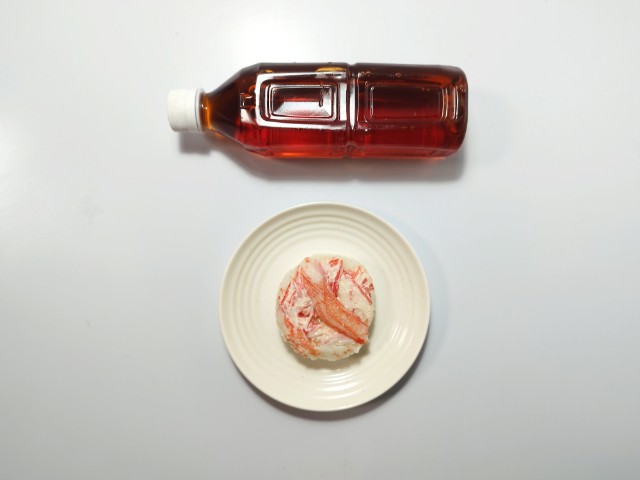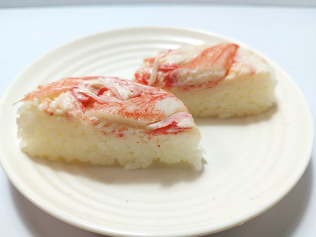 かにかまと酢飯の間にかにかまのからしマヨネーズ和えが入っています。