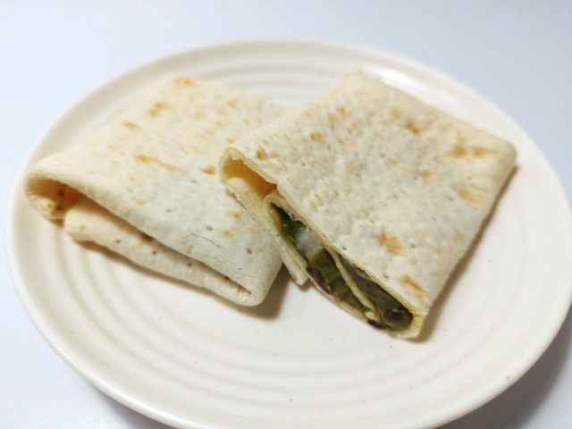 抹茶とあずき、もちを使ったブリトーです。スイーツ系のブリトーというと、ブリトーあんバター(2025年10月29日発売)やブリトーなると金時使用おさつチーズ(2025年10月29日発売)がありますが、今回はそれに続く第三弾といった感じかもしれません。そんなブリトーですが、トルティーヤ生地はもちもちとした食感と歯切れの良さで、安定の美味しさです。中には宇治抹茶を使った抹茶クリームとあずき、もちが入っていて、抹茶の苦味と小豆の風味、ほどよい甘味があって、美味しいのひと言です。もちがよく伸びて、食感を楽しむ事が出来るのもポイント高いです。大きさは小腹を満たすにはちょうど良いサイズで、おやつや軽く甘味が欲しい時にピッタリです。ぜひMATCHAあずきもちのブリトーを食べてみて下さい。