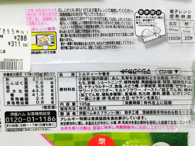 熱量:256kcal、たんぱく質:7.6g、脂質:5.9g、炭水化物:44.3g(糖質:41.9g、食物繊維:2.4g)、食塩相当量:0.8g