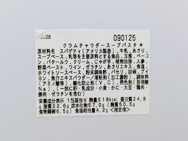 クラムチャウダーのスープパスタです。以前の購入が2025年12月17日発売だったので、約1ヶ月以上経っていますが、価格は変わっていません。今回は販売地域の変更にて再販されたといった感じで、今後も同様に色々な地域で発売されるのかもしれません。そんなクラムチャウダースープパスタですが、スープはあさりの旨味と野菜の甘味、クリームのなめらかな味わいがあって、間違いのない美味しさです。パスタはほどよい硬さと小麦の風味で、スープとのバランスも良いです。具材にはあさりやベーコンを始め、人参や玉ねぎ、じゃがいもといった野菜も入っているので、最後のひと口まで飽きることなく食べられます。内容量は1食分にちょうどよく、お腹も満たされます。ぜひクラムチャウダースープパスタを食べてみてください。
