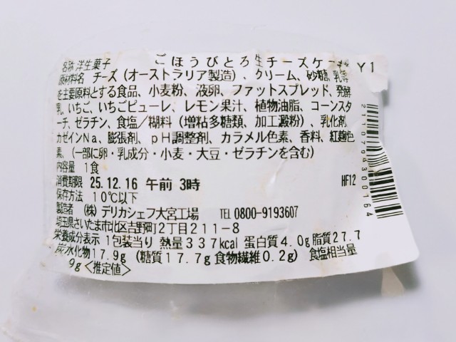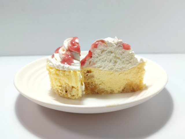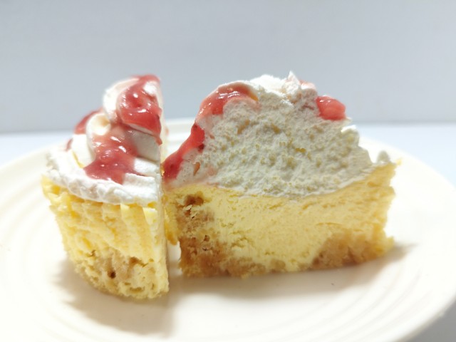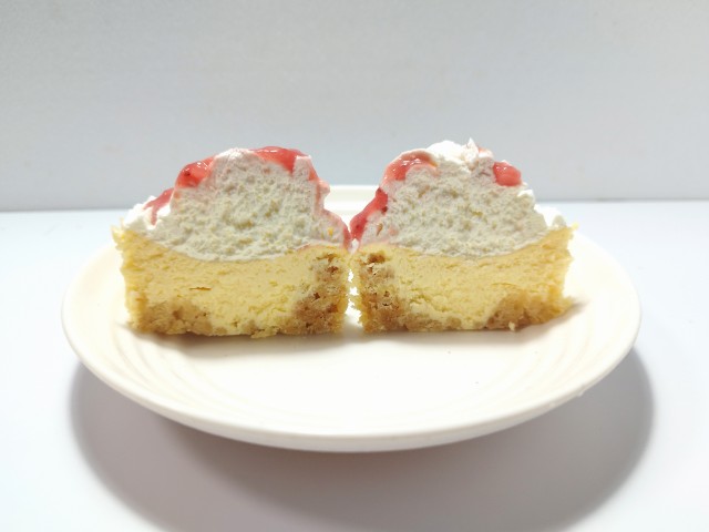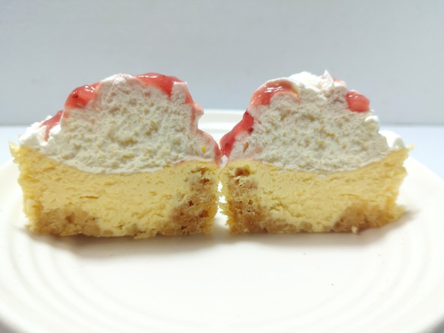 ホイップクリームがのったチーズケーキです。ごほうびの言葉に惹かれて買ってみた商品で、ちょっとお高いながら、個人的には楽しみにしていた新商品の一つでもあります。そんなごほうびとろ生チーズケーキですが、上から果肉入りいちごソース、ホイップクリーム、チーズケーキ、クランブルとなっていて、果肉入りいちごソースは果肉の食感とほのかな酸味、ホイップクリームはなめらかな味わいとミルクの風味で、相性抜群の組み合わせになっています。チーズケーキはとろける食感とクリームチーズの濃厚な味わいで、美味しいのひと言です。クランブルはサクサクとした食感と香ばしさで、味や食感のアクセントになっています。価格を考えると何個も食べられる感じではありませんが、たまに贅沢をしたい時にはピッタリの一品だと思います。大きさは手のひらサイズくらいで、おやつや食後のデザートにオススメです。ぜひごほうびとろ生チーズケーキを食べてみて下さい。