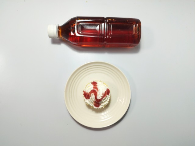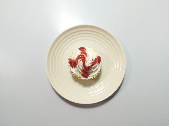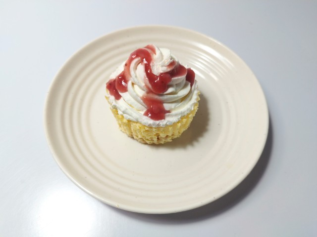 ホイップクリームの上に果肉入りいちごソースがかかっています。