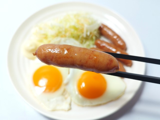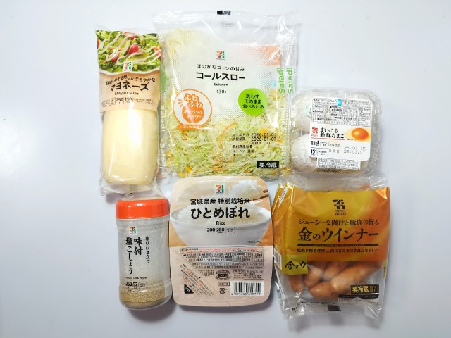 金のウインナーです。金のウインナーというとプラスチック容器に入った金のウインナーを想像する方も多いと思いますが、今回は袋に入った金のウインナーになっています。そんな金のウインナーですが、肉の旨味とあふれる肉汁、ほどよい弾力の肉質で、美味しいのひと言です。プラ容器の金のウインナーと比べると皮のパリッと感とジューシーさは弱いですが、朝食やお弁当など日常使いのウインナーとしては十分過ぎるくらいだと思います。今回は使用用途を考えて、イメージしやすいように他の食材を使って再現してみましたが、あくまでセブンイレブンの食材のみで作っているので、見た目や内容はご理解いただけると助かります。一応、それぞれの価格ですが、7プレミアム特別栽培米宮城県産ひとめぼれ 198円(税込213.84円)、7Pフレッシュこだわり新鮮たまご4個 208円(税込224.64円)、7プレミアムコールスロー 128円(税込138.24円)、7プレミアム マヨネーズ 250G 218円(税込235.44円)、7プレミアム 味付塩こしょう250G 198円(税込213.84円)を使っていますが、全部は使い切れていないので、1食あたりの金額は算出していません。もちろん、もっと安い食材や良い材料をスーパーや専門店などで見つければあると思います。と、ここまで色々と言っておいてなんですが、今回の商品は埼玉県と限られてしまっているので、購入するのはちょっと厳しいかもしれません。ただ、一部店舗で販売として紹介していた商品が、翌々週の新商品としてほぼ全国で発売となったりしているので、この商品ももしかしたら同様に販売されるかもしれません。まだまだ、その地域のセブンイレブンでしか買えない商品はたくさんあって、皆さんの地域にもあると思います。今回の商品もこんな商品を売っているんだ的な感覚で見てもらって、高そうや美味しくなさそうといった見方や、ご自身の地域でしかない商品の比較などにしてもらえたら嬉しく思います。と言っているのに申し訳ないですが、締めの言葉は必要ですので最後に、ぜひ金のウインナーを食べてみてください。