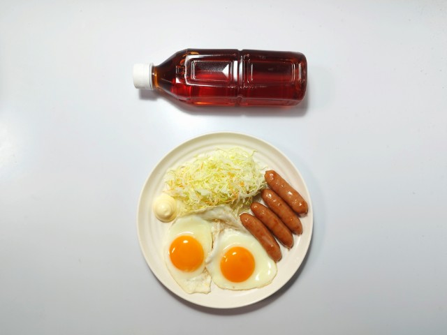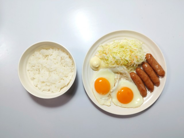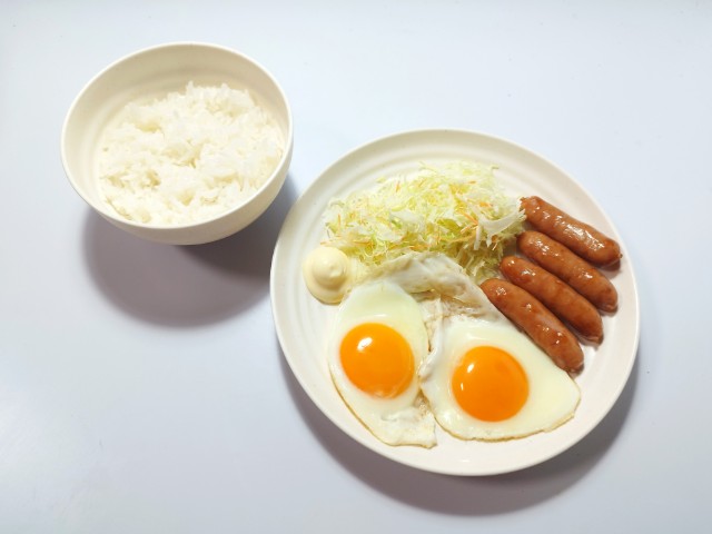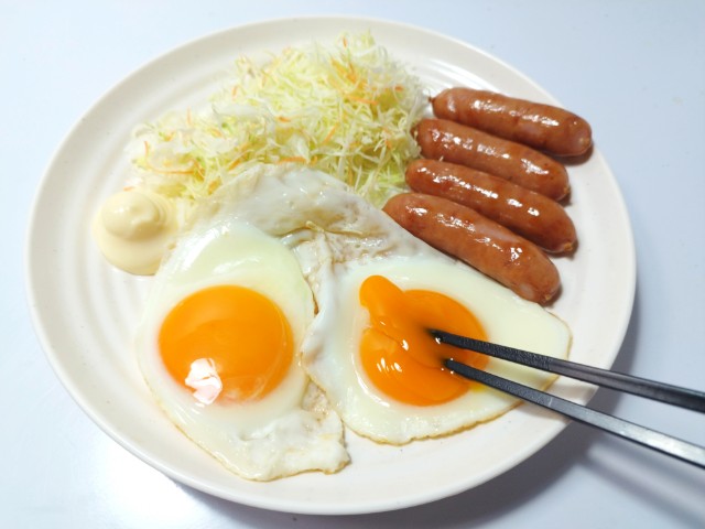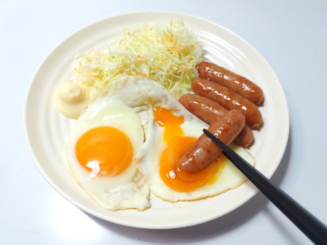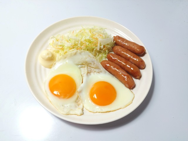 金のウインナーとたまごを焼いて、コールスローとマヨネーズをそえたら完成です。
