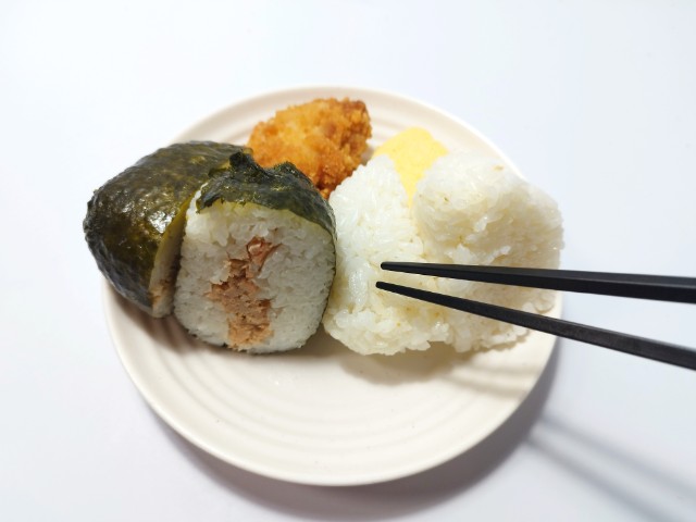 おにぎり2個と食べ応えのあるおかずのセットです。