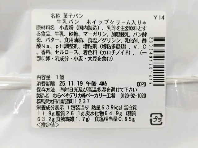 榛名牛乳を使った牛乳パンです。商品名に惹かれて、見つけた瞬間に手に取ってしまいました。そんな榛名牛乳仕込みのモぎゅっと牛乳パンですが、生地はふんわりとした食感とミルクの風味、ほのかな甘味があって、美味しいのひと言です。中にはホイップクリームが入っていて、なめらかな食感とミルクのコクで、生地とのバランスも良いです。口の中に甘ったるさが残らないので、甘いのがちょっと苦手な方にも食べやすい菓子パンになっていると思います。大きさは普通の菓子パンサイズで、おやつや小腹が空いた時にピッタリです。ぜひ榛名牛乳仕込みのモぎゅっと牛乳パンを食べてみて下さい。