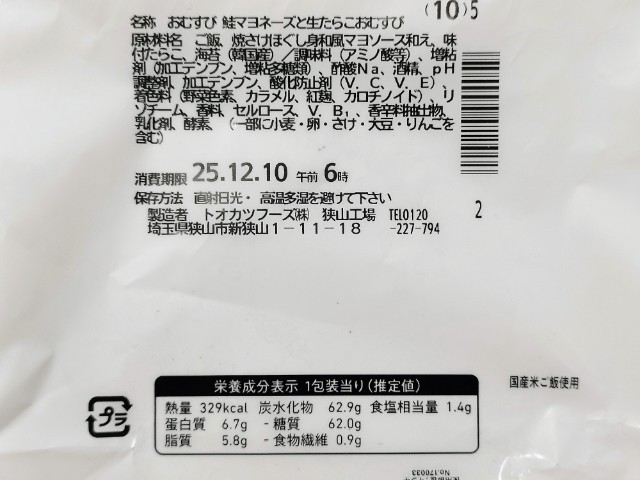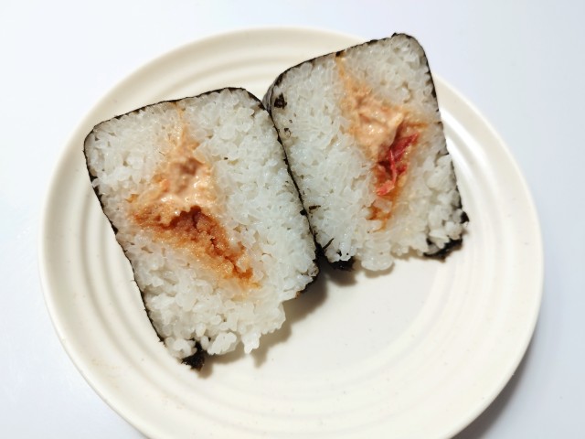 鮭マヨネーズと生たらこが入った大きなおむすびです。以前にぼんご監修 大きなおむすび 鮭マヨネーズと生たらこ(2025年8月26日発売)がありましたが、今回は監修商品ではなく、原材料も微妙に違っています。そんな大きなおむすびですが、中の具材には生たらこと鮭マヨネーズが使われていて、鮭マヨネーズはだしの風味とマヨネーズのなめらかな味わい、生たらこはたらこの濃厚な味わいとほどよい塩味で、ご飯が進む組み合わせになっています。見た目以上にしっかりとした味わいの中具になっているので、食べた後の満足度も高いです。定番手巻おむすびの約1.5倍というだけあって、しっかりと大きさがあるので、おむすび1個でお腹も軽く満たされると思います。ぜひ鮭マヨネーズと生たらこの大きなおむすびを食べてみて下さい。