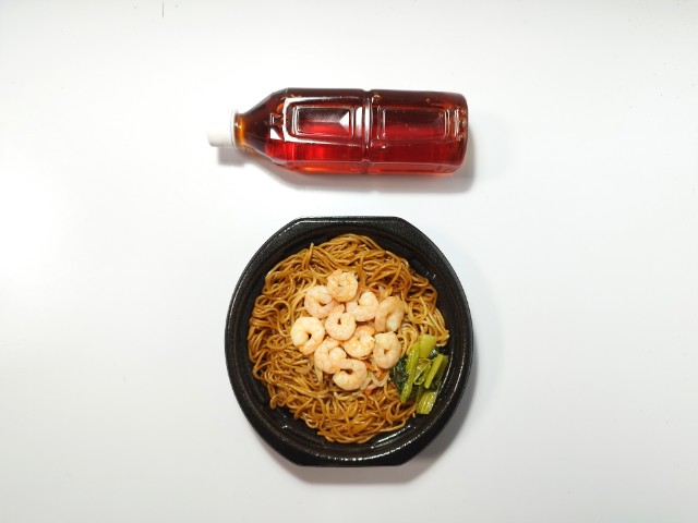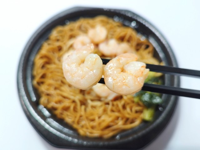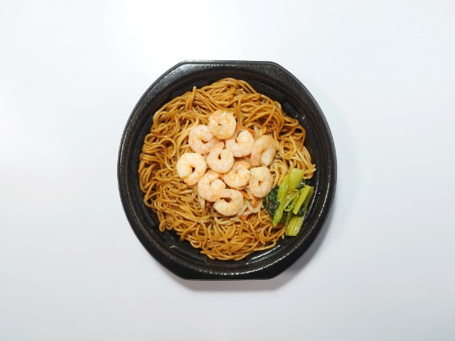 海老がのった上海風焼そばです。海老が10尾のったインパクトある見た目に惹かれて買ってみました。そんな海老上海風焼そばですが、醤油の風味とオイスターソースの旨味があって、間違いのない美味しさです。麺はツルっとした食感と歯切れの良さで、箸がどんどんと進みます。具材には海老を始め、小松菜炒めやもやし人参炒めがのっていて、それぞれの味や食感を楽しめます。特に海老はぷりぷりとした食感とほのかな甘味があって、美味しいのひと言です。今回はそのまま食べましたが、マヨネーズやラー油を加えて、味変しながら食べても美味しいと思います。内容量は1食分にちょうどよく、お腹も満たされます。ぜひ海老上海風焼そばを食べてみて下さい。