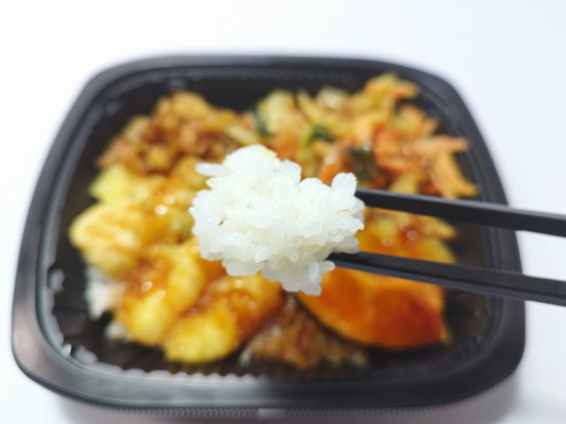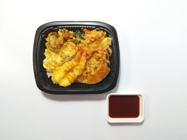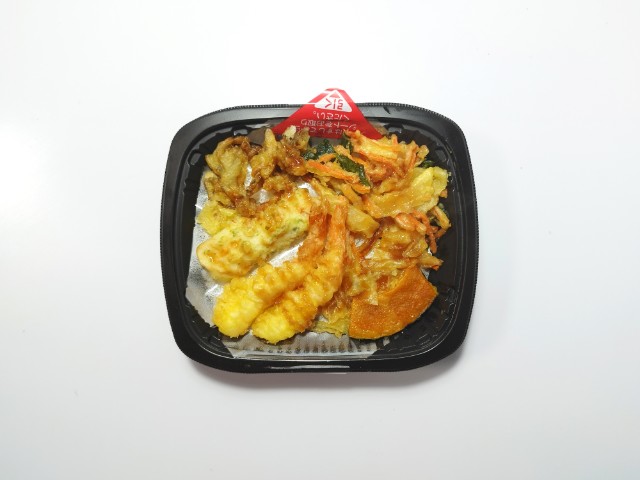 6種類の天ぷらがのった天丼です。色々な天ぷらがのったお弁当で、その見た目に惹かれて買ってみました。そんな天丼ですが、海老天と舞茸天、ちくわの磯辺天にさつまいも天、かぼちゃ天、小松菜と人参、玉ねぎのかき揚げといった3種類の野菜天を加えた計6種類の天ぷらがのっています。衣はサクッとはしていませんが、油のしつこさはなく、食材の美味しさもしっかりと楽しめます。また、天ぷらには醤油たれが軽くかかっているので、そのままでも食べられますし、別添の天たれをかけても美味しく食べられます。撮影では天たれを先にかけていますが、個人的にはそのままの状態を楽しんだ後に天たれをかけて、また違った味わいを楽しむのがオススメです。内容量は1食分にちょうどよく、お腹も満たされます。ぜひ6種具材の天丼を食べてみて下さい。