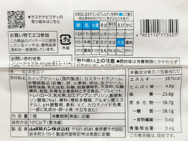 熱量:387kcal、たんぱく質:4.8g、脂質:23.8g、炭水化物:38.7g(糖質:38.1g、食物繊維:0.6g)、食塩相当量:0.4g