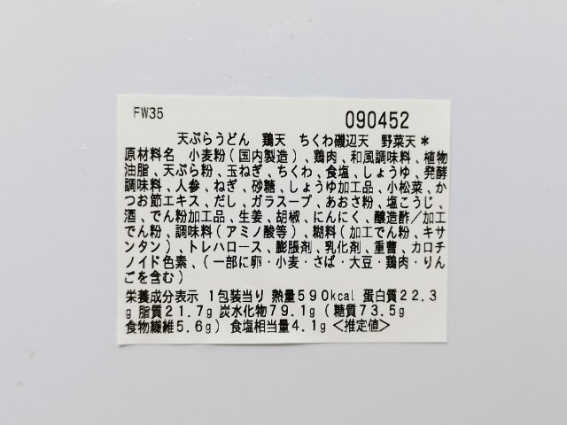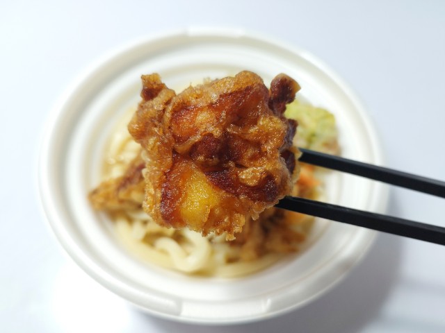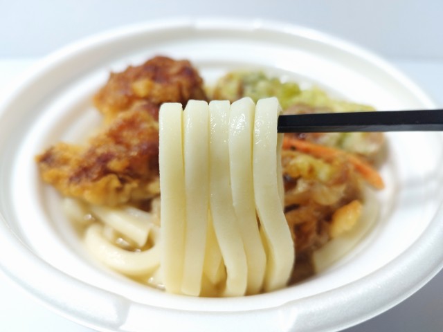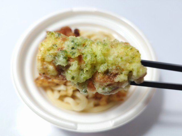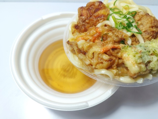 3種類の天ぷらがのったうどんです。以前の購入が2025年12月17日発売だったので、約2ヶ月近く経っていますが、価格は変わっていません。今回は販売地域の変更にて再販されたといった感じで、今後も同様に色々な地域で発売されるのかもしれません。そんな天ぷらうどんですが、つゆはだしの旨味とやさしい塩味で、飲み干してしまいたくなる美味しさです。うどんはつるりとした食感とのどごしの良さで、つゆとのバランスも良いです。トッピングの鶏天は大小2個入っていて、鶏肉のほどよい弾力とジューシーな味わいを楽しめます。ちくわ磯辺天はちくわの味わいとあおさの風味、野菜天は人参や玉ねぎ、小松菜の味わいで、つゆに浸して食べても美味しいです。内容量は1食分にちょうどよく、お腹も満たされます。ぜひ天ぷらうどんを食べてみてください。