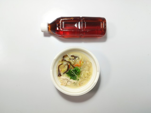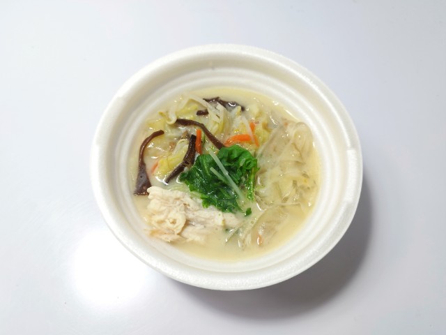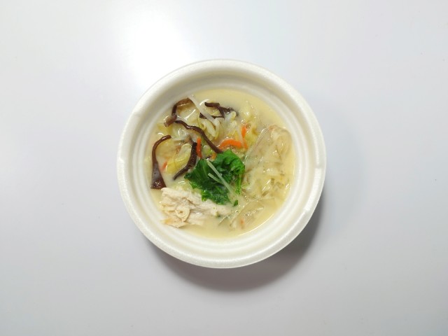旨味がつまった鶏白湯を、豆乳のまろやかなコクで包み込んだ濃厚な味付けです。1/3日分の野菜とつるもち食感の太麺春雨を使用した食べ応えのあるスープです。