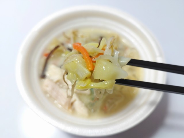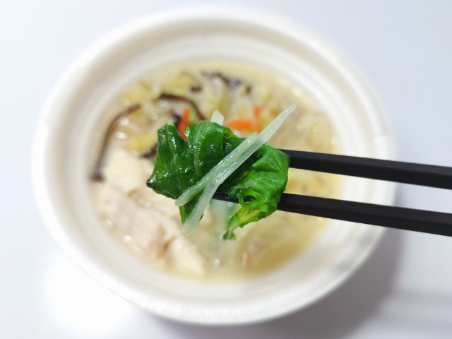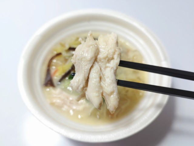 太麺春雨を使った鶏白湯です。以前につるもち太麺春雨 麻辣湯(2026年2月10日発売)がありましたが、今回は鶏白湯になっています。そんな鶏白湯ですが、スープは鶏の旨味とだしの風味、豆乳のまろやかな味わいがあって、一気に飲み干してしまいたくなる美味しさです。具材には太麺春雨を始め、蒸し鶏、もやし、キャベツ、きくらげなどが入っていて、それぞれの味や食感を楽しめます。今回はこのまま食べましたが、お腹に余裕があれば、おむすびやご飯を入れて雑炊風にしても美味しいと思います。内容量は一人分にちょうどよく、ご飯のおかずやお酒のお供にピッタリです。ぜひ鶏白湯を食べてみてください。