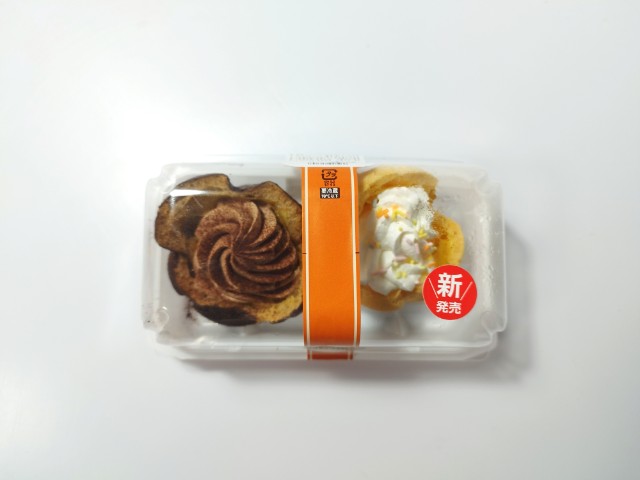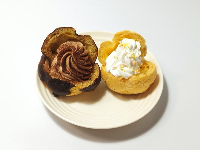 プレーンとチョコの2個入りアソートシュークリームです。それぞれ、中には、クリームとホイップクリームが入ったWクリーム仕立てです。