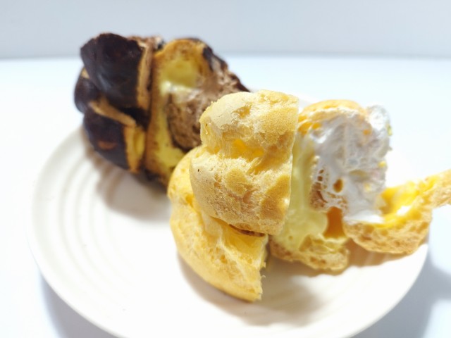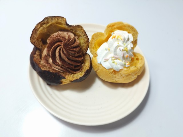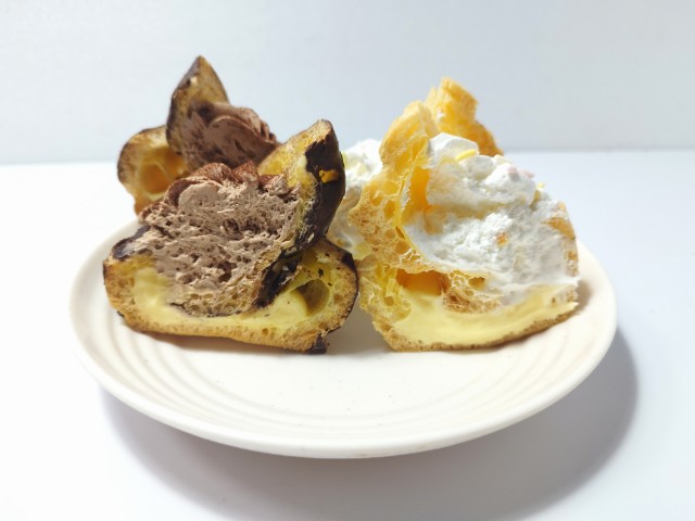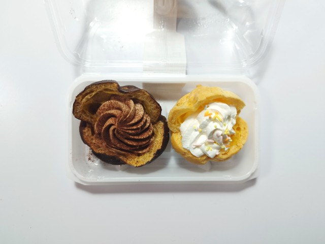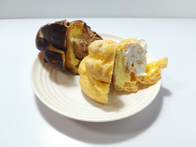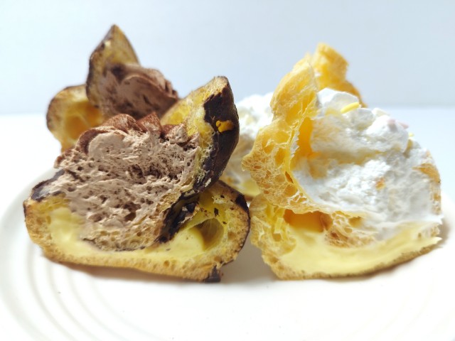 プレーンとチョコの2種類が入ったシュークリームです。見た目の華やかさに惹かれて買ってみました。そんなシュークリームですが、生地はしっとりとした食感とほのかな塩味、さらにチョコのシュークリームにはチョココーティングがされていて、チョコの甘味も楽しむ事が出来ます。プレーンのホイップクリームはミルクのコクとなめらかな味わい、チョコのチョコホイップクリームはチョコの風味ととろける食感で、シュー生地とのバランスも良いです。また、ホイップクリームの下にはカスタードクリームが入っていて、とろりとした食感とたまごの風味で、味のアクセントになっています。2個入ですが、1個はふた口サイズくらいなので、一人でも普通に食べ切れます。もちろんシェアするにもピッタリです。ぜひダブルクリームシューを食べてみて下さい。