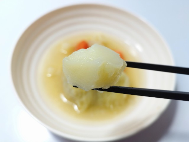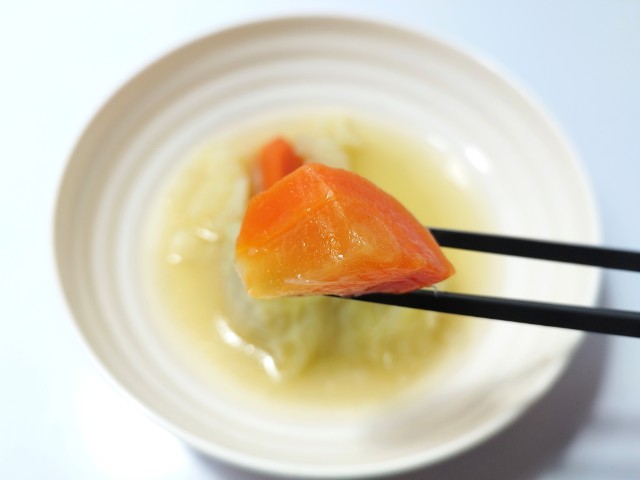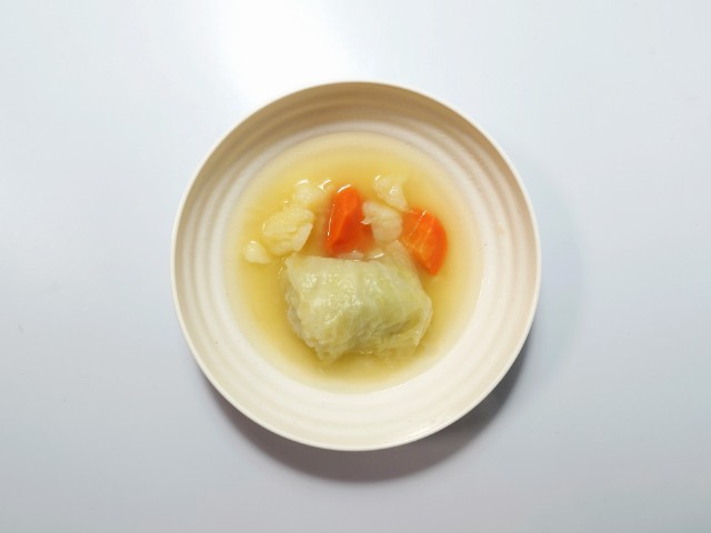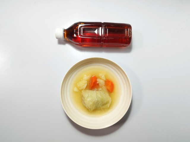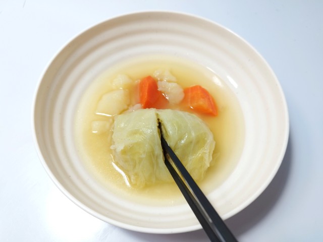 金のロールキャベツです。7プレミアムゴールドシリーズの新商品で、見つけた瞬間に手に取ってしまいました。そんな金のロールキャベツですが、外のキャベツはやさしい甘味ととろけるような食感、中のひき肉は肉の旨味とふわふわの食感で、間違いのない美味しさです。スープはブイヨンの旨味とほどよい塩味で、ロールキャベツにも味がしっかりと染みています。他にもじゃがいもや人参が入っていて、こちらもほろほろと崩れてしまうくらいに柔らかいです。内容量は一人分にちょうどよく、おつまみやご飯のおかずにオススメです。と、ここまで色々と言っておいてなんですが、今回の商品は一部店舗と限られてしまっているので、購入するのはちょっと厳しいかもしれません。ただ、一部店舗で販売として紹介していた商品が、翌々週の新商品としてほぼ全国で発売となったりしているので、この商品ももしかしたら同様に販売されるかもしれません。まだまだ、その地域のセブンイレブンでしか買えない商品はたくさんあって、皆さんの地域にもあると思います。今回の商品もこんな商品を売っているんだ的な感覚で見てもらって、高そうや美味しくなさそうといった見方や、ご自身の地域でしかない商品の比較などにしてもらえたら嬉しく思います。と言っているのに申し訳ないですが、締めの言葉は必要ですので最後に、ぜひ金のロールキャベツを食べてみてください。