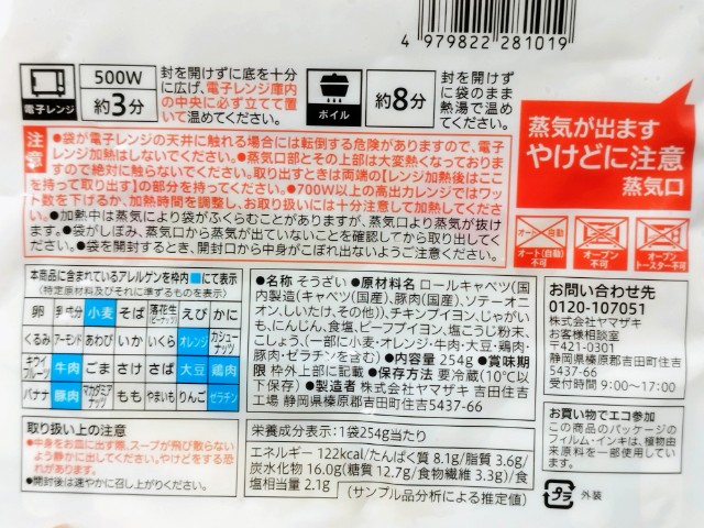 熱量:122kcal、たんぱく質:8.1g、脂質:3.6g、炭水化物:16.0g(糖質:12.7g、食物繊維:3.3g)、食塩相当量:2.1g