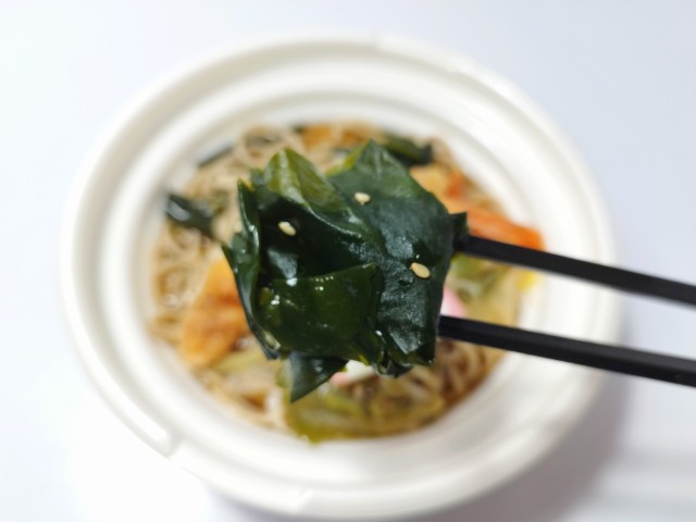 海老天とわかめ胡麻和えなどがのった温かいそばです。以前に海老天二八そば 2本入(2024年8月21日発売)がありましたが、海老天の本数や具材の内容が違うので、今回は別物として紹介しています。ちなみにその前年には海老天二八そば3本入(2023年11月29日発売)が発売されていて、個人的には毎年海老の本数が減っていっている印象です。と話がズレましたが、そんな海老天そばですが、つゆはだしの旨味とほどよい塩味があって、飲み干してしまいたくなる美味しさです。そばはそばの風味とコシがあって、つゆとのバランスも良いです。つゆが染みた海老天はジュワっと溢れる衣の味わいとプリっとした海老の食感で、美味しいのひと言です。他にもわかめ胡麻和えやかまぼこ、ねぎといった具材が入っているので、最後のひと口まで飽きることなく食べられます。内容量は1食分にちょうどよく、お腹も満たされます。ぜひ海老天そばを食べてみてください。