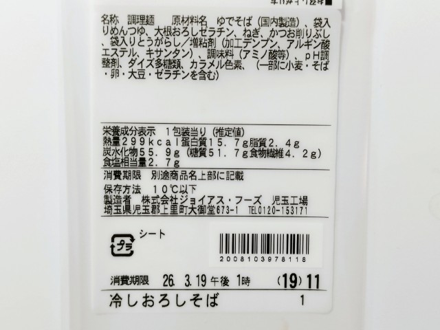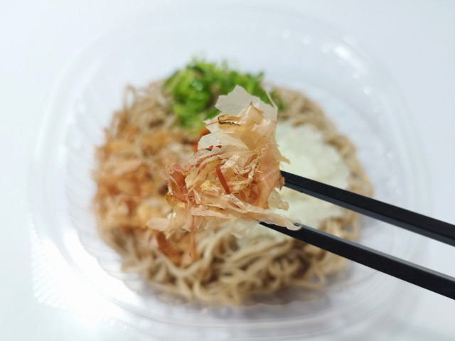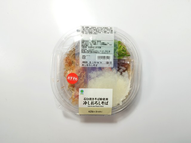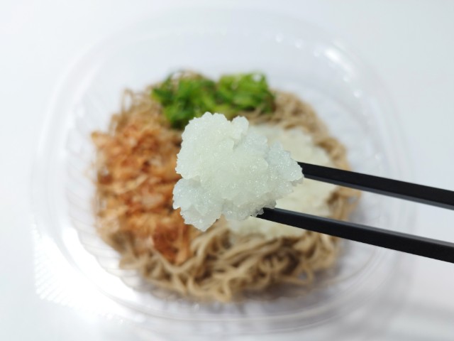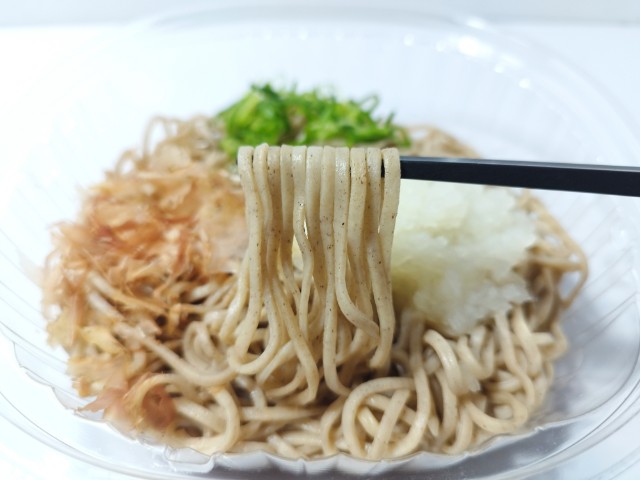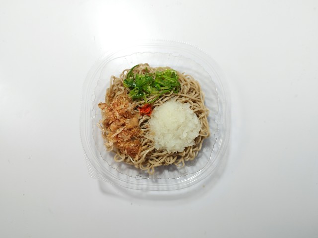 大根おろしが入った冷たいそばです。以前の購入が2025年12月23日発売だったので、約3ヶ月近く経っていますが、価格は変わっていません。そんな冷しおろしそばですが、そばはそばの風味としっかりとしたコシがあって、どんどんと食べ進められます。そばつゆはだしの旨味と醤油の風味があって、そばとの相性抜群です。ポイントはやはり大根おろしで、大根のほのかな甘みとさっぱりとした味わいで、見た目以上にあっさりと食べられます。他にも花かつおや青ねぎものっているので、最後のひと口まで飽きることなく食べられます。内容量は1食分にちょうどよく、お腹も満たされます。ぜひ冷しおろしそばを食べてみてください。
