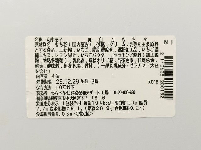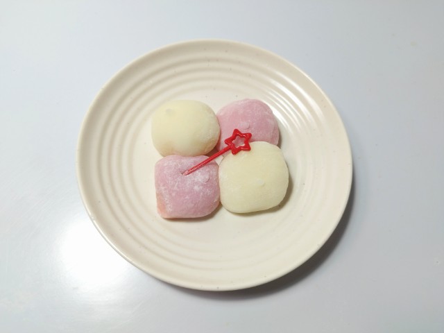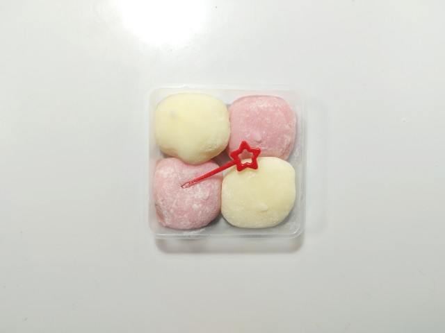 紅白こもちです。いちごクリームの入ったピンク色の大福練乳みるくクリームを包んだ白い大福が入って商品で、その見た目に惹かれて買ってみました。そんな紅白こもちですが、生地もちっとした食感ほのかな甘味で、色による味の違いはないようです。いちごクリームいちごの風味果肉のほのかな食感練乳みるくクリームほどよい甘味練乳の味わいで、生地とのバランスも良いです。4個入ですが、1個ひと口サイズなので、一人でも普通に食べ切れます。ぜひ紅白こもちを食べてみてください。