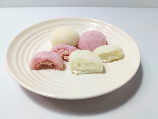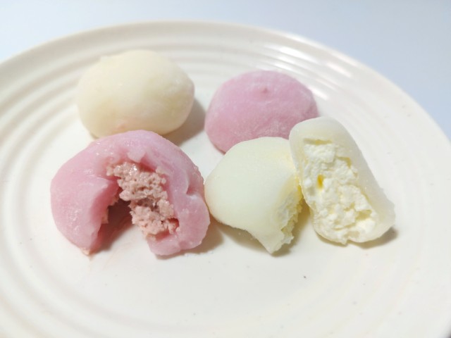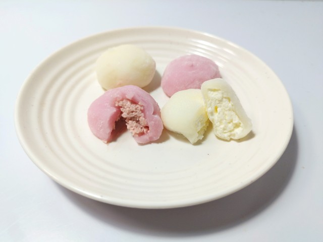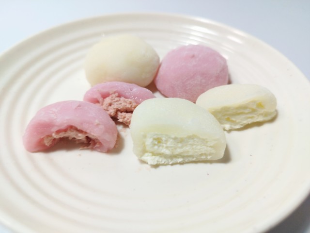 いちご果肉入りのいちごクリームを包んだピンク色の大福と、練乳みるくクリームを包んだ白い大福が入った商品です。